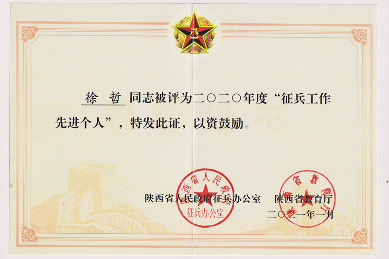 近日,陕西省人民政府征兵办公室和陕西省教育厅下发《关于表彰2020年高校征兵工作先进单位和先进个人通报》(陕征〔2021〕6号)文件。我校荣获2020年度高校“征兵工作先进单位”荣誉称号,我校征兵工作站站长徐哲同志被评为2020年度“征兵工作先进个人”。