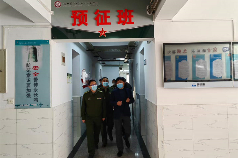 在检查过程中,保卫处(武装部)处长徐哲向鄠邑区武装部领导介绍了我校“预征班”的发展计划和现状,延伸汇报了我校今年预征工作的进展以及我校对退伍学生的安置情况。简单来说“预征班”就是为学生架起了通向梦想的桥梁,打造了“选苗”“育苗”“助长”的兵员征集完整链条。