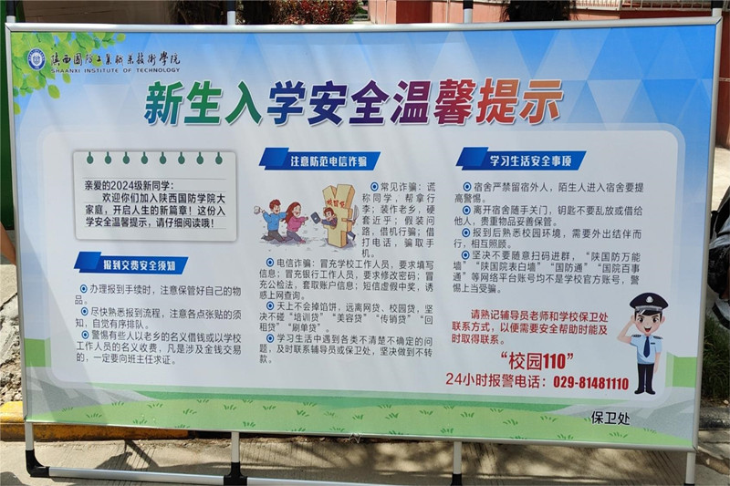 保卫处在公寓前设置《新生入学安全温馨提示》,提升新生安全防范意识,筑牢新生安全防线。