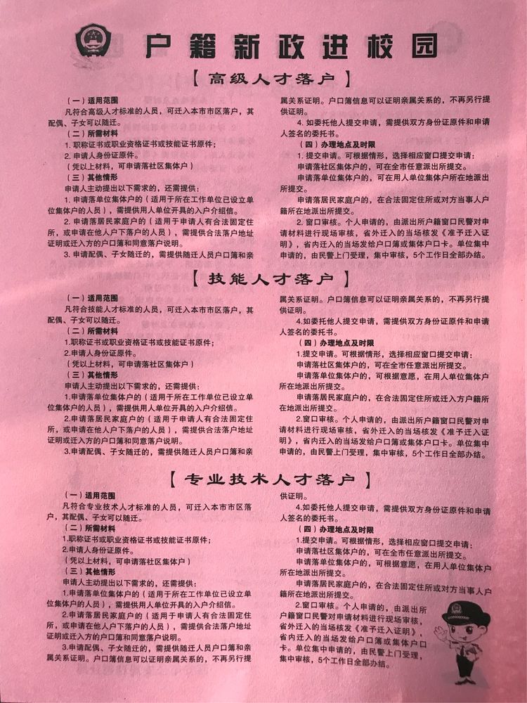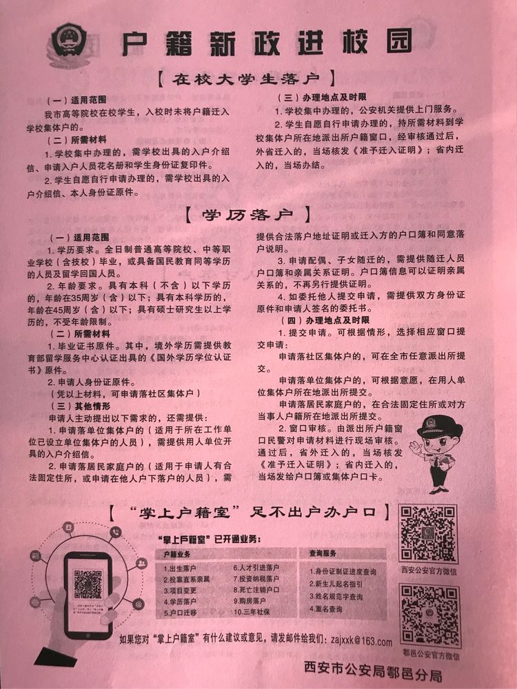 号称西安市"史上最宽松"的户籍准入新政策。欢迎有意向落户西安的我校师生来我校保卫处办公室咨询办理,符合落户条件的高级人才办理落户可由公安机关上门集中受理,提供"零跑腿"、"管家式"落户服务。特别说明,我院教师公寓于2017年12月已在公安机关建档立户,凡愿落户北校区的教职工可直接到城关派出所办理落户手续。