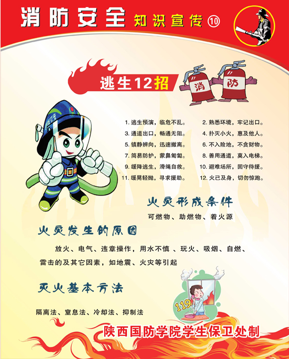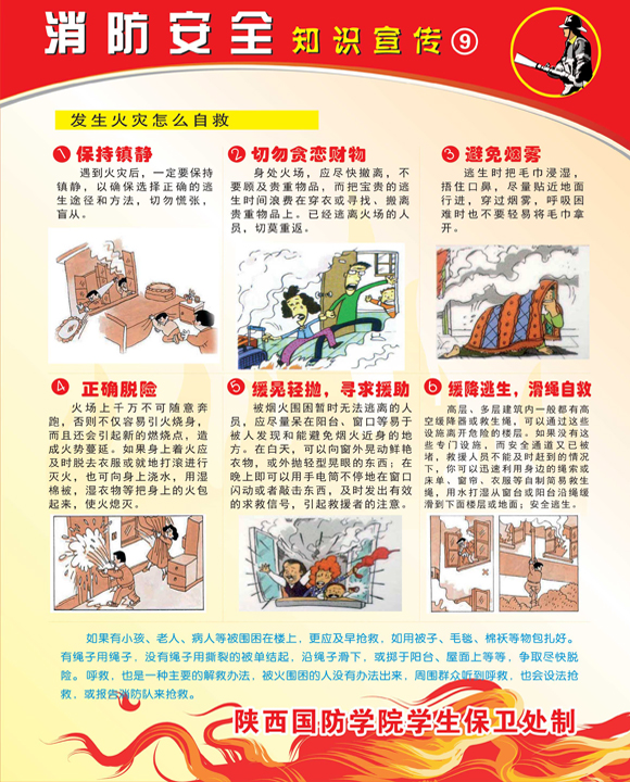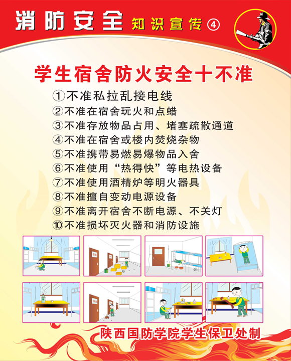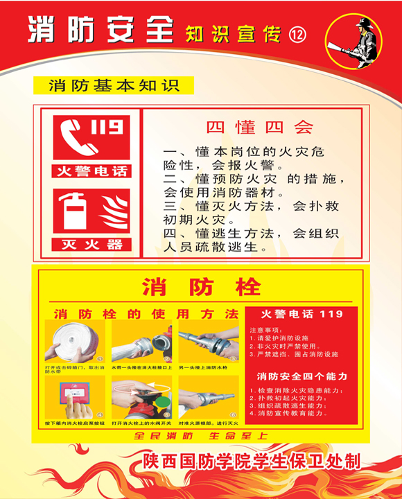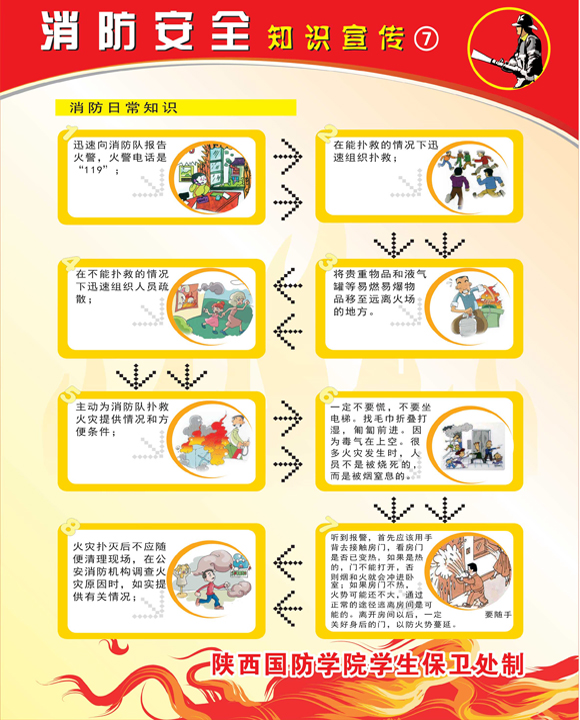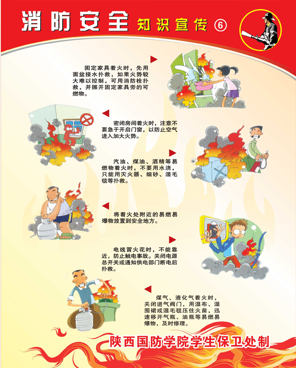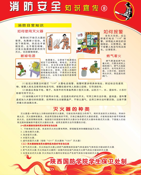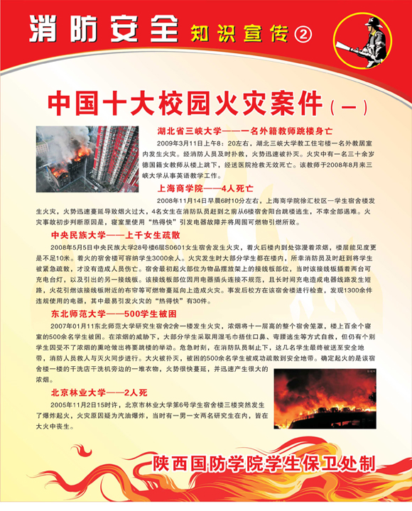 在第二十五届消防宣传周之际,为进一步提高广大师生的消防安全意识,杜绝消防安全隐患,能使广大师生熟练掌握各类消防器材的使用,在发生重大火灾的情况下能顺利逃生,保卫科精心制作了一批展板,将在公寓楼、教学楼、餐厅等场所向大家宣传消防安全知识,同时,也诚恳的希望大家能够认真学习。提高消防意识,共建和谐校园。