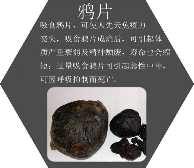 鸦片是从罂粟果里提炼出来的一种棕褐色或黑色膏状物,在医学上称为“阿片”,在民间叫“大烟”、“烟土”、“烟膏”等。
