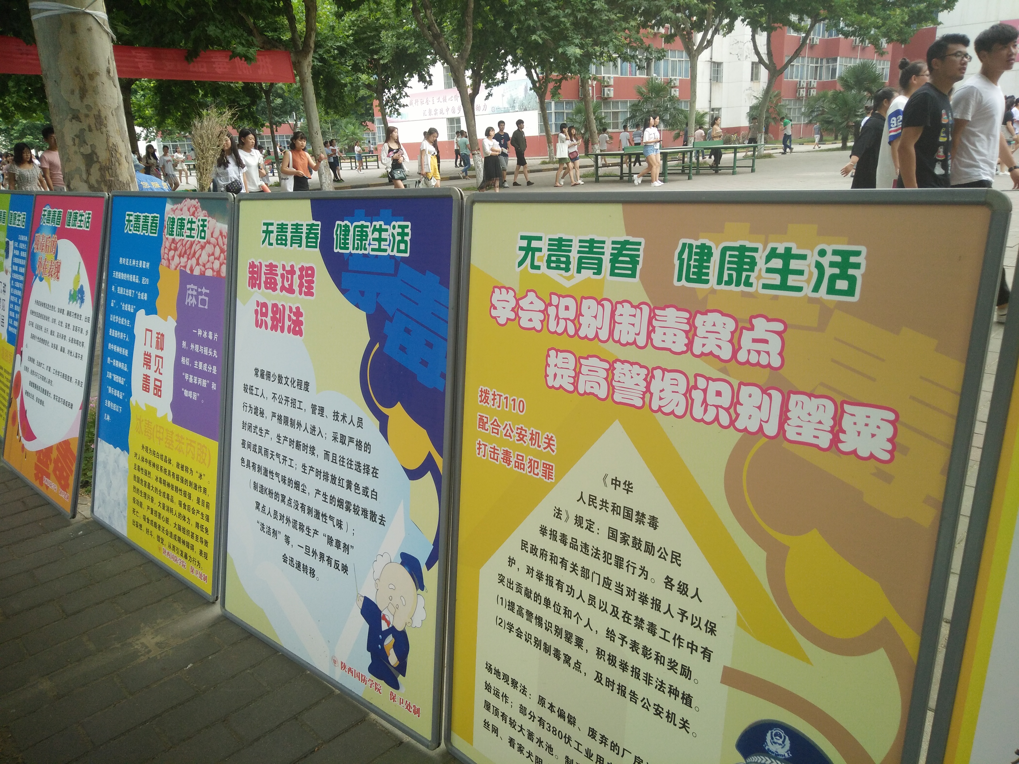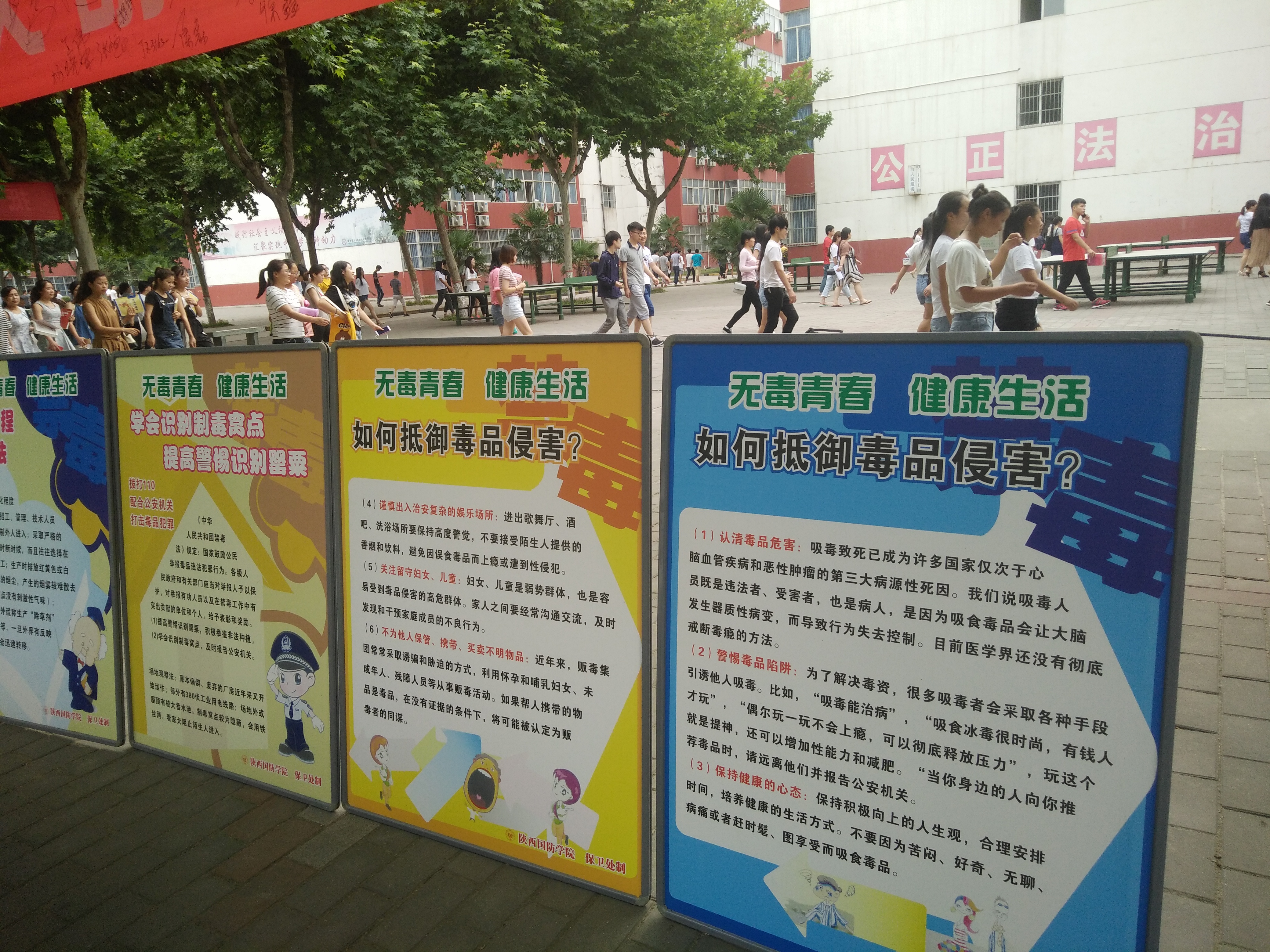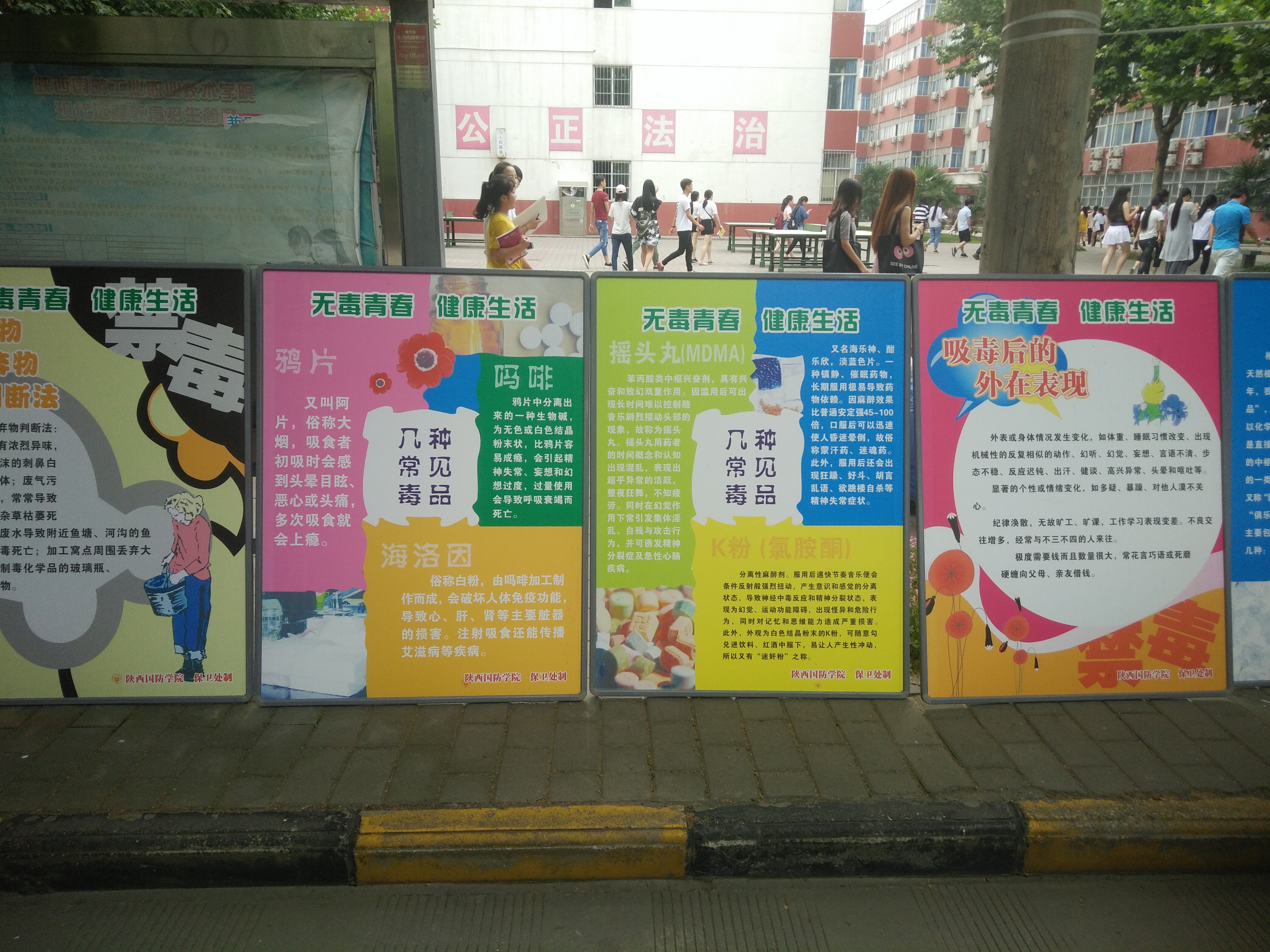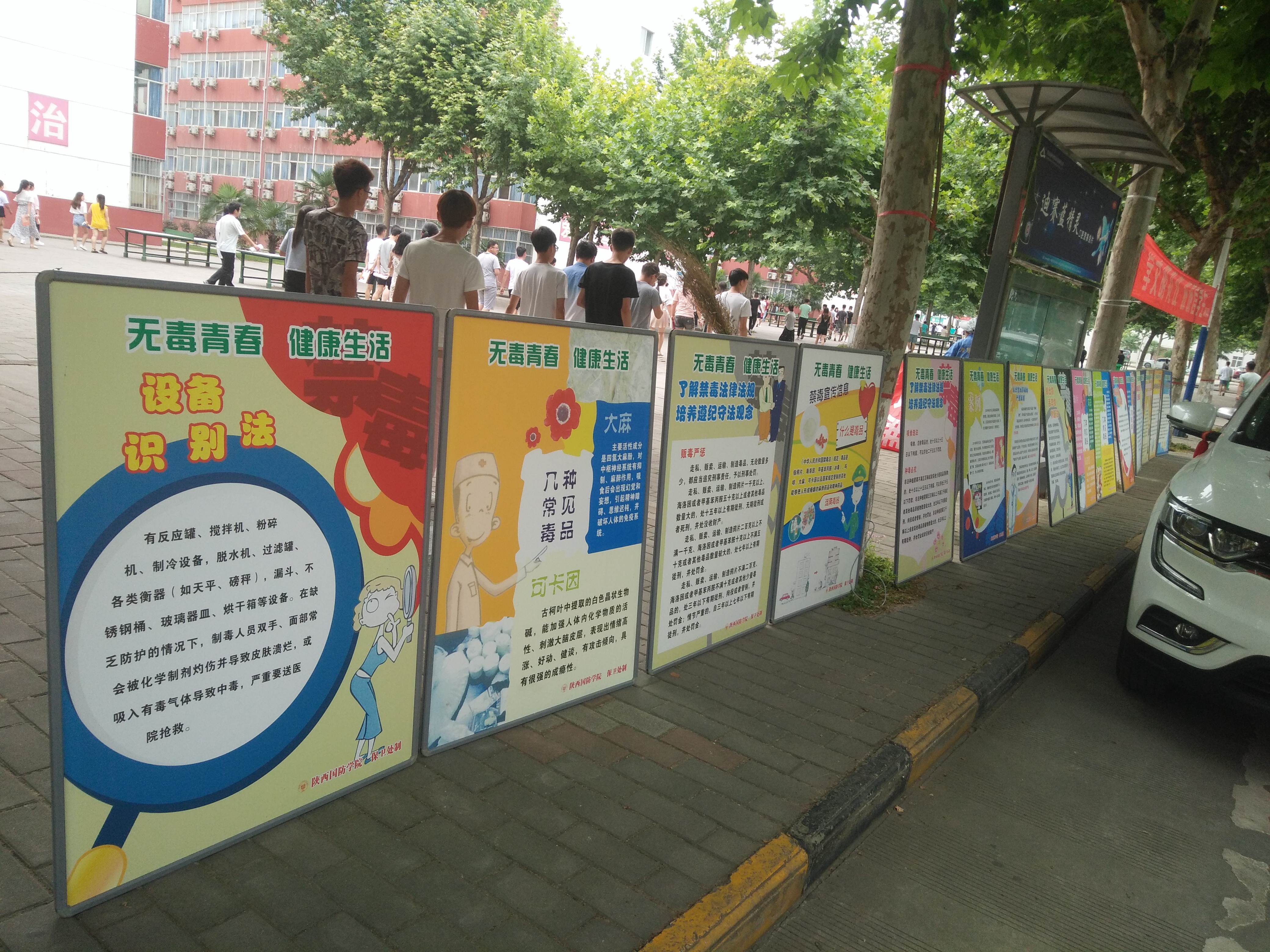 为贯彻落实陕西省委高教工委办公室关于切实做好2018年禁毒工作的通知,我院保卫处于6月19号以展板、横幅的形式在学生公寓东侧向广大学生宣传毒品知识以及毒品的危害,展板内容丰富,图文并茂,对我院师生了解毒品知识,自觉抵制毒品起到了非常好的促进作用。