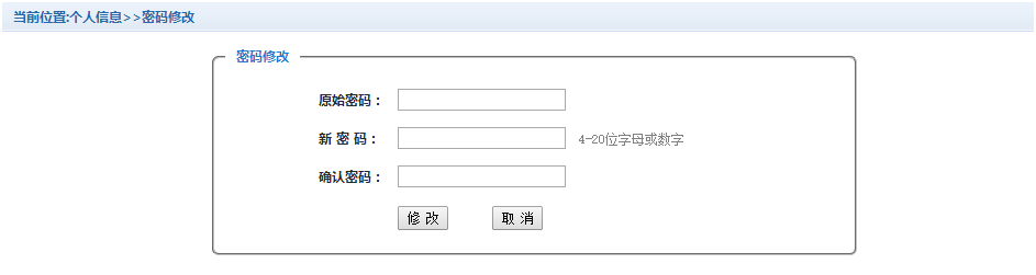 点击个人信息界面的个人信息修改,显示3.2.1-1所示的个人信息维护界面。在相应的输入框,输入需要修改的个人信息,点击“修改按钮”完成个人信息维护。未保存前,点击“重置”按钮,还原个人信息。