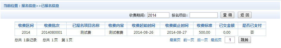 点击最下面的报名按钮完成报名,可直接跳转到缴费界面,完成缴费;