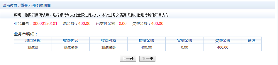 B. 确认业务单 确认业务单项目、金额无误。点击“下一步”。如图3.5-2所示。