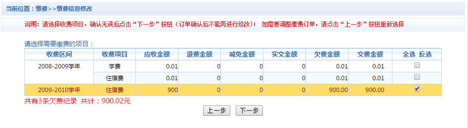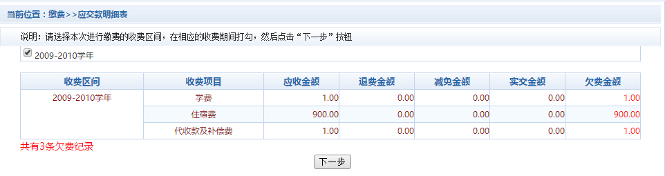 点击导航栏的“学费缴费”按钮,显示学费欠费和选择页面,如图3.4-1所示:
