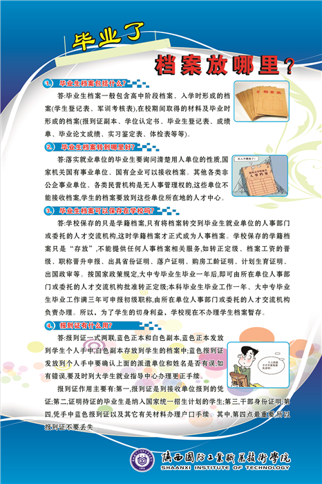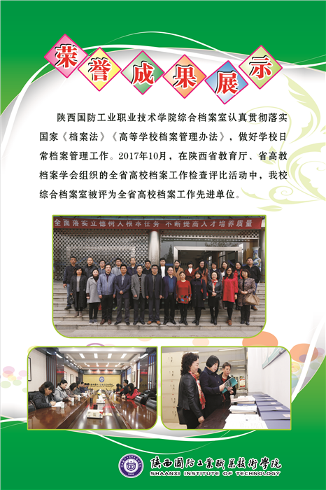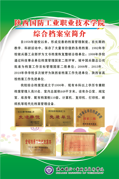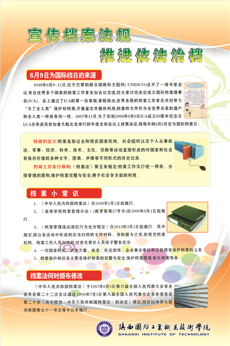6月9日是国际档案日,为了更好的宣传档案“存凭、留史、资政、育人的特殊价值”,记录历史,服务中心工作的重要作用,学校综合档案室举办了档案宣传活动。此次宣传的主题是“走进档案”,主要内容分四个方面,第一简单介绍了国际档案日及档案法,第二对我校档案室及档案工作取得的成绩进行了简要介绍,第三对学生档案进行宣传,最后让大家了解我校综合档案室的主要工作内容。