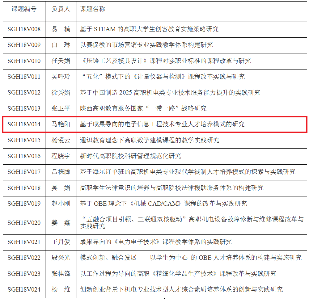 近日,陕西省教育科学规划领导小组办公室发布了《关于公布陕西省教育科学“十三五”规划2018年度课题立项名单的通知》(陕教科规办〔2018〕10号),公布了今年的陕西省教育科学规划课题立项名单,我院教师马艳阳的“基于成果导向的电子信息工程技术专业人才培养模式的研究”成功获批立项。