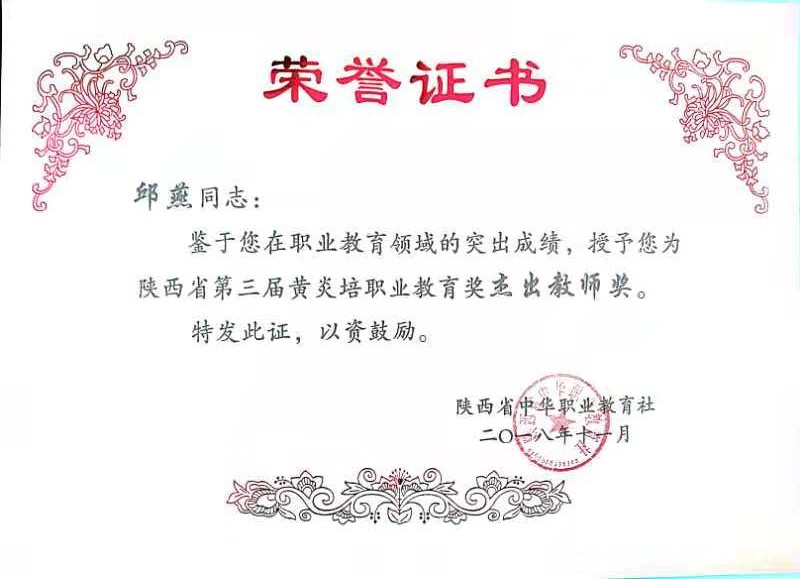 中华职教社是我国成立最早的职业教育社团。职教社作为中国共产党领导的职业教育群众团体,在职业教育理论研究、搭建平台、合作交流、职教扶贫、社会服务等方面做出了大量艰辛的工作,为进一步推进职业教育的发展做出了重大贡献。为弘扬黄炎培职业教育思想,树立职业教育先进典型,引导和推动职业教育创新发展,陕西省中华职教社在全省范围内开展陕西省第三届黄炎培职业教育奖评选活动,其中我院教师邱燕荣获杰出教师奖。