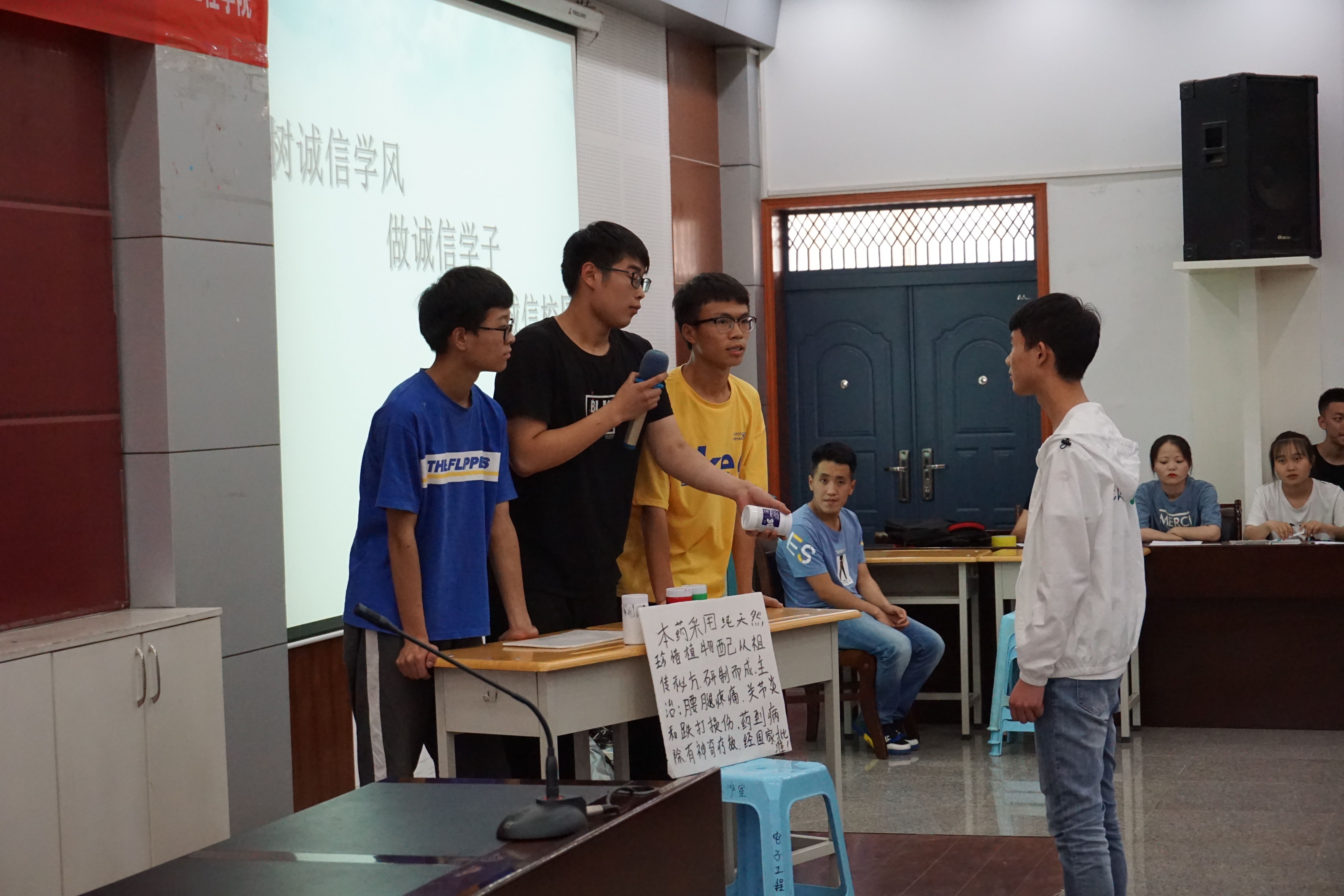 本次活动主要内容包含两个部分:首先是诚信话剧比赛,比赛现场,演员们精彩用心的表演以及每个剧所要传达的深刻涵义,都给观众和评委们留下了深刻印象。经过激烈的角逐和公正的评判,电子3181班的《一张卷子》凭借出色的演出、精彩的剧情以及积极健康向上的主题摘得本次大赛的冠军。信息3181的《卖药》夺的二等奖、无人机3181班的《作弊记》获三等奖。其次,在诚信征文活动中的优秀作品进行了演讲和颁奖环节。