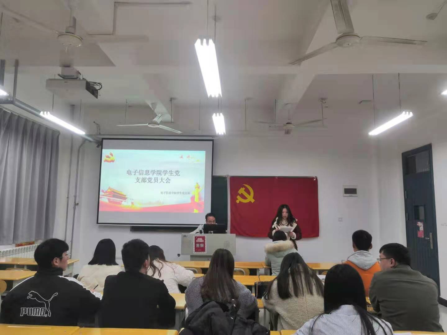 本次大会由电子信息学院党支部张晗同志主持,会议严格按照程序进行。大会正式开始,共分五项议程,最后学生党支部张晗同志作为领誓人,带领支部全体党员庄严宣誓。铿锵的誓言,激荡着全体党员心中的真挚情感,让全体党员回顾了申请入党时的思想激情和奋斗追求,牢记我们共产党人的历史使命,激励党员同志用自身的实际行动践行誓词。