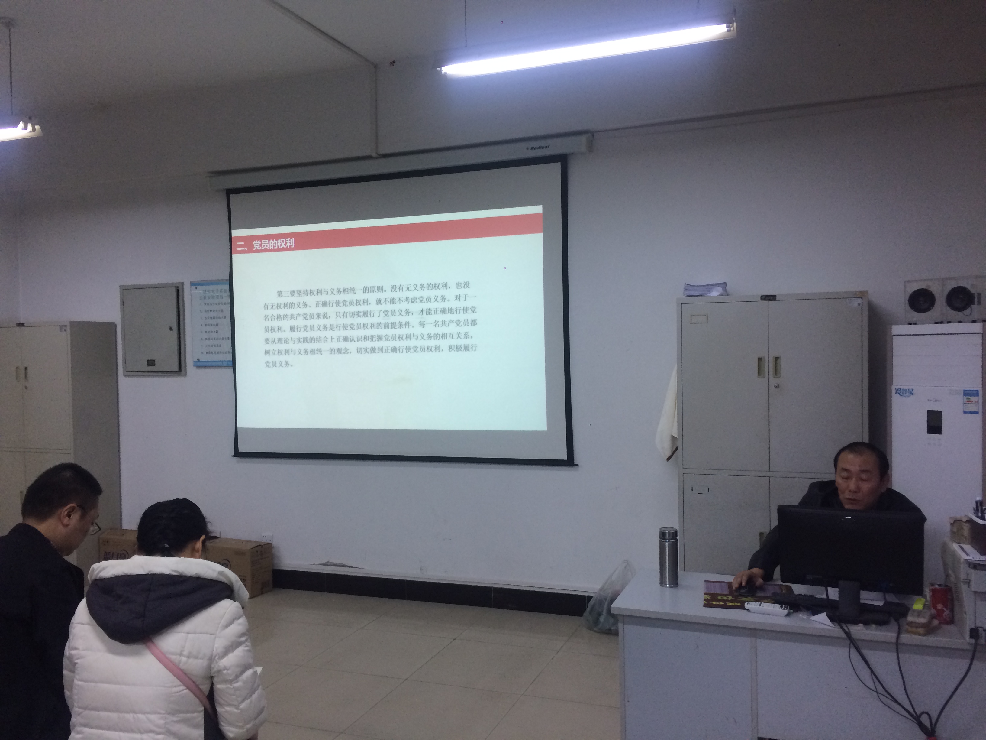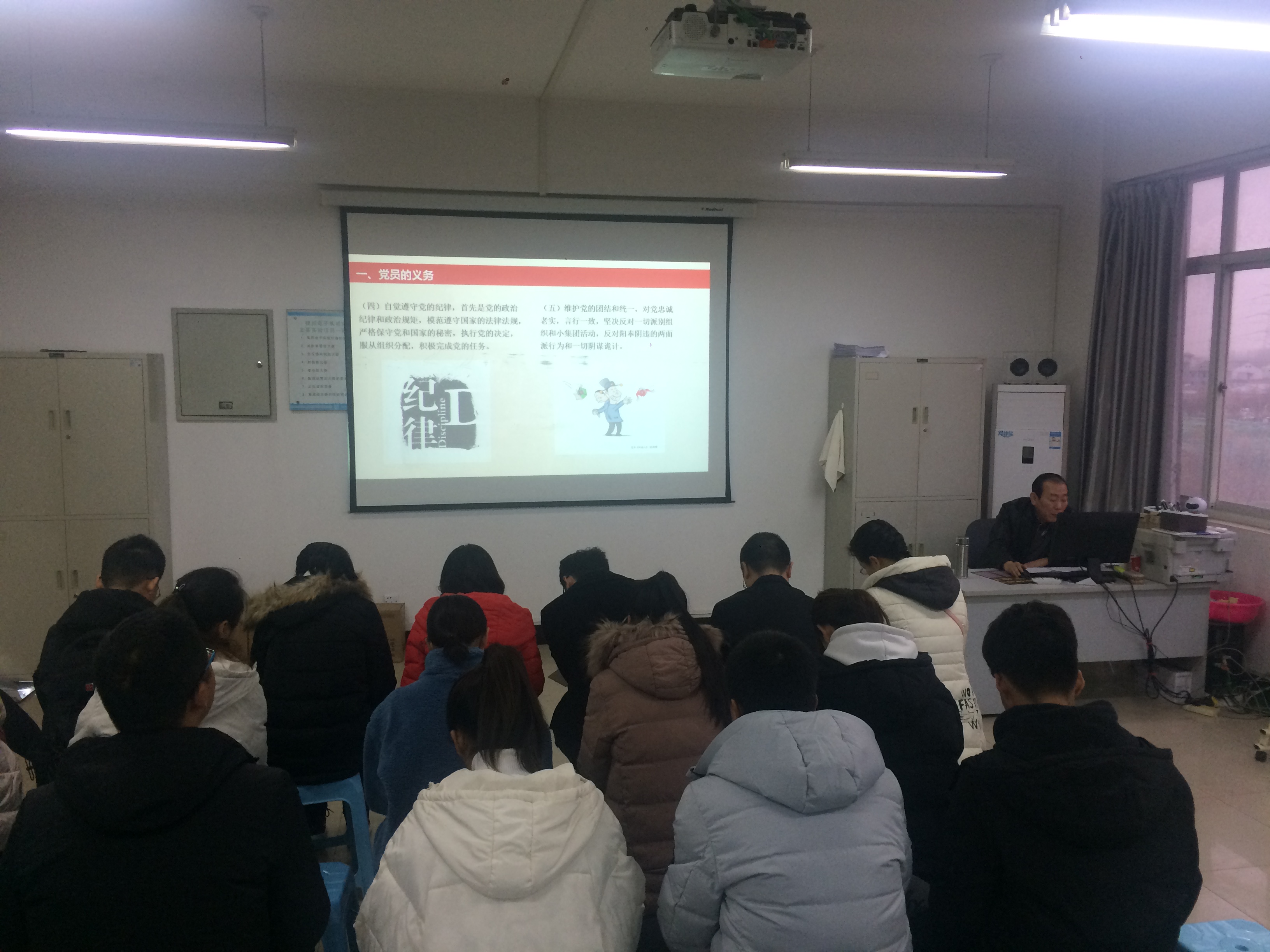 电子工程学院党总支于2018年12月4日在北校区8-404组织全体党员同志进行党课学习,本次党课是由分院党总支书记张双琦老师主讲,张书记主讲的内容是《党员的权力于义务》。张书记从以下三个方面对党员的权利和义务做了详尽的讲述:1党员义务的内容、规定党员义务的重要意义及履行党员义务的途径;2党员权利的内容及正确行使党员权利的方法;3党员义务与党员权利的辩证关系。
