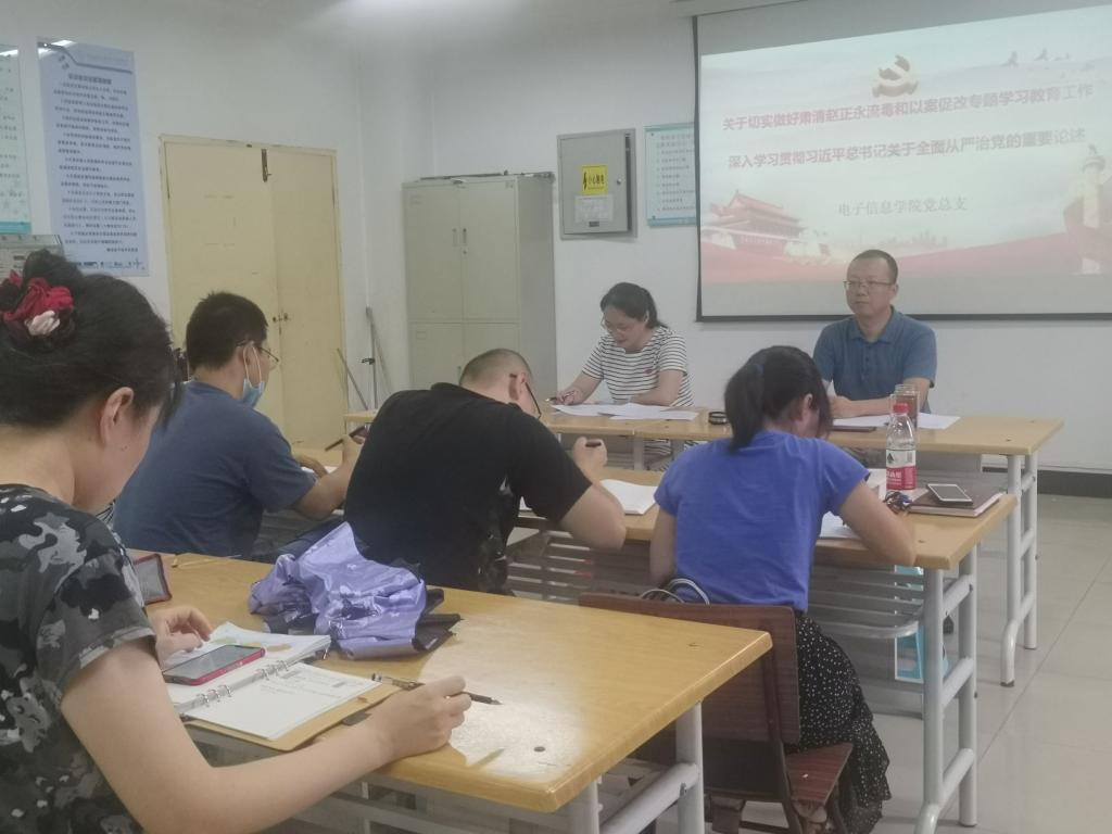 根据省委教育工委《关于切实做好肃清赵正永流毒和以案促改专题教育学习教育工作安排的通知》要求和基层党组织专题学习安排,8月4日下午,电子信息学院党总支组织全体党员在8-404教室开展了以案促改第三次专题学习会议,会议由党总支书记赵鹏主持。