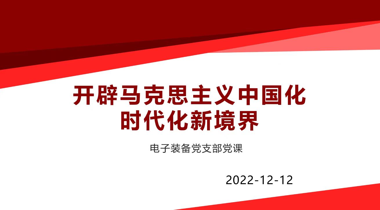 为深入学习习近平新时代中国特色社会主义思想的重要指示精神,2022年12月12日下午,电子装备教师党支部在线上召开了“开辟马克思主义中国化时代化新境界”主题党课,党课由支部书记屈宝鹏主讲。主要学习内容如下: