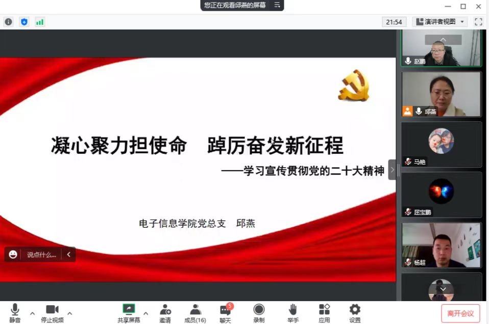 为深入学习宣传贯彻党的二十大精神,进一步用党的创新理论武装头脑、指导实践、推动工作,12月13日下午4:30分,电子信息学院党总支开展了讲党课活动,本次党课由电子信息学院党总支书记赵鹏主持,电子信息学院院长邱燕为电子信息学院全体党员教师讲授了一堂生动的党课。