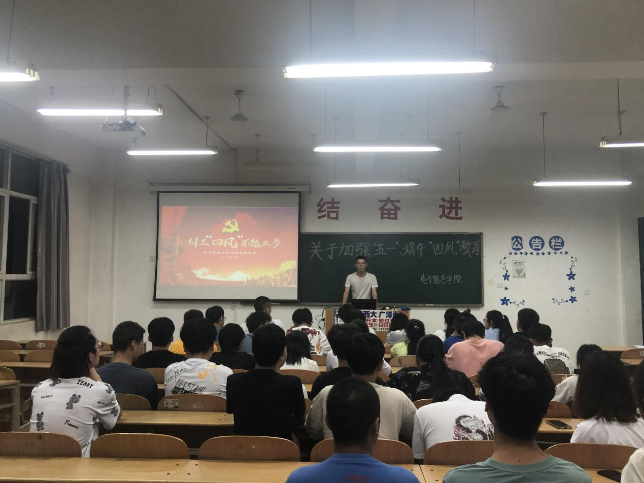 为深入贯彻落实中央八项规定精神,持续纠治“四风”,坚决杜绝“节日腐败”,推进我校全面从严治党向纵深发展。电子信息学院于4月29日在3-422举办节假日廉洁”四风“教育活动。张晗老师讲解,学生党员认真听取并积极发言。