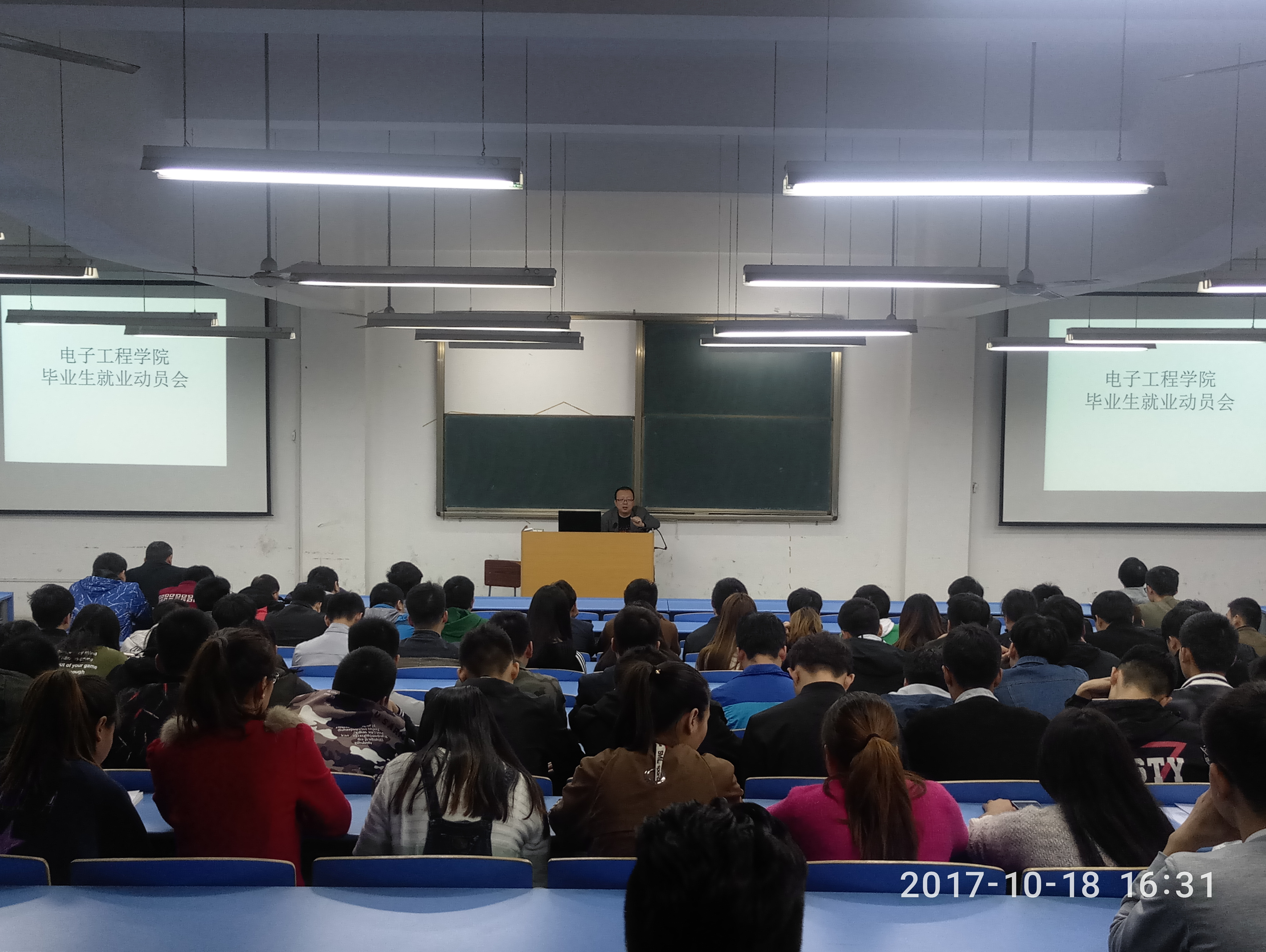 2017年10月18日下午4:30在北校区3-131电子工程学院召开2018届毕业生就业动员会。本次会议由分院学生科长赵鹏老师主持,分院领导、分院辅导员老师和18届毕业生参加。会议首先由赵鹏老师对18届毕业生就业形势作了细致的分析并从学生个人出发对就业中的目标、定位、条件、距离、计划五个方面作了详细的讲解,告诉18届毕业生就业的重要性,督促学生积极参加学校组织的招聘会。最后,由分院党总支书记张双琦老师对学生就业中出现的问题作了讲解,告知学生需要注意的问题。