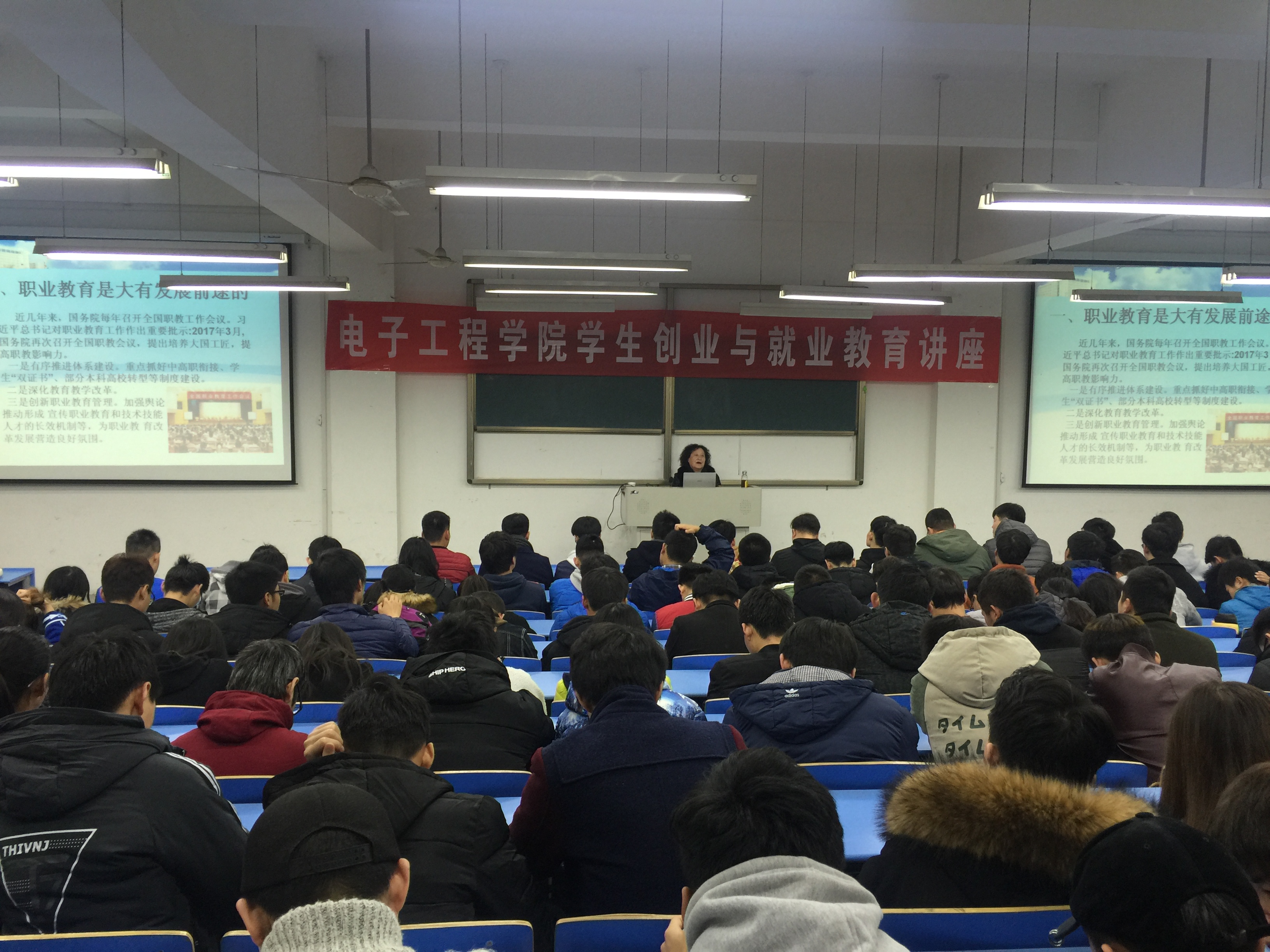 电子工程学院于2017年12月12日下午4:30在北校区3-129邀请陈黛琴老师为分院在校学生做关于“学生创业与就业”教育讲座。陈老师主要从以下四个方面做以讲述:1、职业教育是大有发展前途的。(习近平总书记、李克强总理关于大学生创新创业的主要精神);2、尽快适应大学生活,珍惜在校美好时光;3、我校部分优秀毕业生创业成功的典型事例;4、立足现实、增强信心,经过几年努力学习,争取学习一门技能,将来取得事业上的成功。