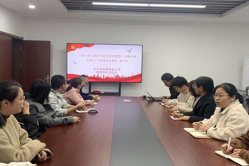 为贯彻落实全国宣传思想文化工作会议精神,进一步推动习近平新时代中国特色社会主义思想进校园走深走实,11月21日下午,数字通信教师党支部邀请我校马克思主义学院张红斌副教授讲授“深入领会学习习近平文化思想”的专题党课。电子信息学院党总支书记赵鹏、数字通信教师党支部党员教师、分院学生入党积极分子代表参加学习。会议由支部书记王海梅主持。