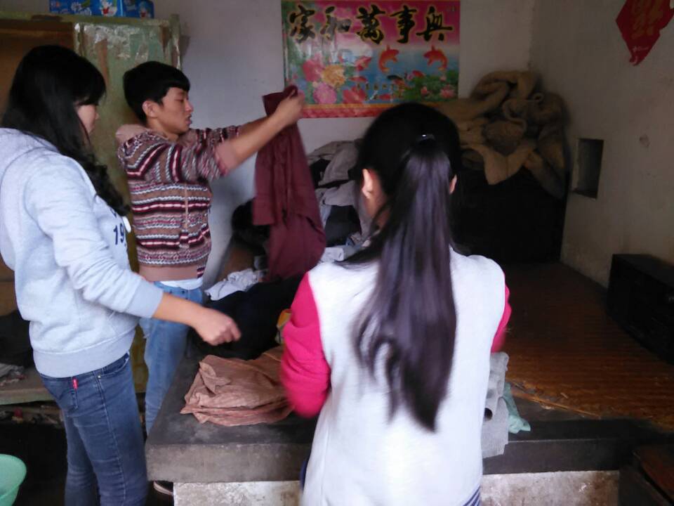 在进入李大伯家中后,首先由学生党支部组织发展委员李向明代表学生党支部全体成员对老人表达了最真挚的问候,接着由全体党员为老人收拾床铺,做一些家务活。之后,由女生陪老人家聊天拉家常,最后同志们在离开时对李大伯表达了最美好的祝愿。