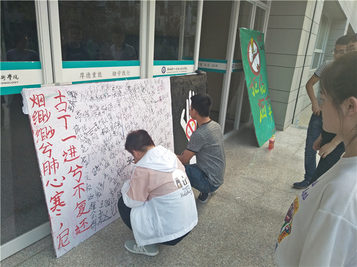——无烟校园,从我做起。在第31个世界无烟日来临之际,5月16日,化工学院开展了“无烟校园,从你我开始”的签名征集活动,签名的同学络绎不绝,同学们用签名的形式表示禁烟的决心,承诺拒绝烟草,健康生活,创建无烟校园。