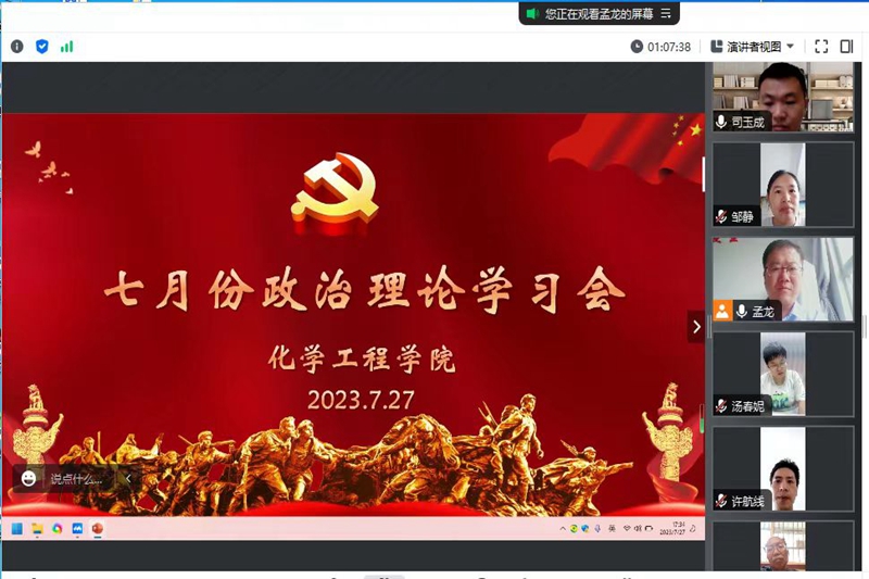 根据我校暑期期间主题教育工作安排,为持续推进主题教育理论学习全面开展,确保暑期主题教育“不断线”见实效,按照陕国职党宣〔2023〕10号《关于2023年7月党员政治理论学习安排的通知》要求,7月27日下午,化学工程学院党总支在线上开展了7月份政治理论学习会暨师德师风专题党课学习会,学习会由化学工程学院党总支书记孟龙主持。