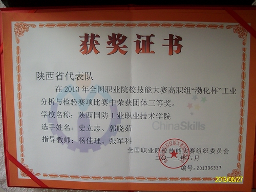 6. 2013年6月获“全国职业院校技能大赛”化工分析技术赛项团体三等奖。