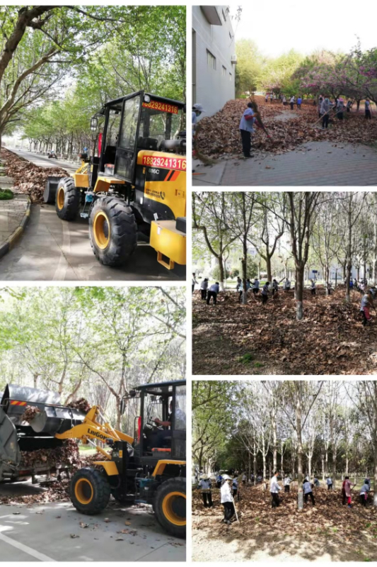 2022年4月10日上午,后勤处组织物业公司人员清理小树林堆积落叶,大家戮力同心,扫、清、运分工明确,高效率地把树林里堆积落叶清理完成。使用专用设备压缩清运树叶60余吨。