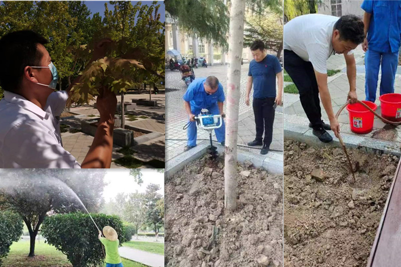 多措并举,人机结合科学抗旱。绿化养护人员按照细浇慢灌、浇足浇透的原则,充分利用现有喷灌设施,调动洒水车、购买了喷灌机等设备,采用机械喷灌、人工浇灌等方式,对绿化带、草地、树木等进行全面浇灌,保证浇水质量,确保绿化浇灌全覆盖。同时,根据树木品种的不同特性,对不耐旱、新栽植的苗木,认真检查浇水后的种植层泥土湿度,做到浇实、浇透、保湿等措施;对旱情严重的树木,进行漫灌,并及时进行除草、松土、围堰,避免土壤板结,增进土壤蓄水保湿能力。