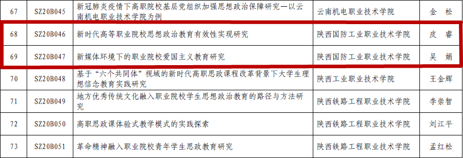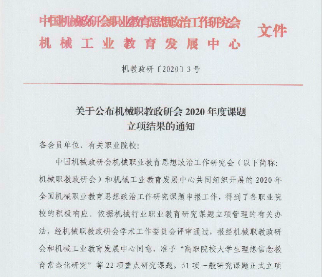 近日,机械职教政研会公布了“机械职教政研会2020年度课题立项通知”,马克思主义学院吴娟主持的《新媒体环境下的职业院校爱国主义教育研究》、皮睿主持的《新时代高等职业院校思想政治教育有效性实现研究》均获立项。