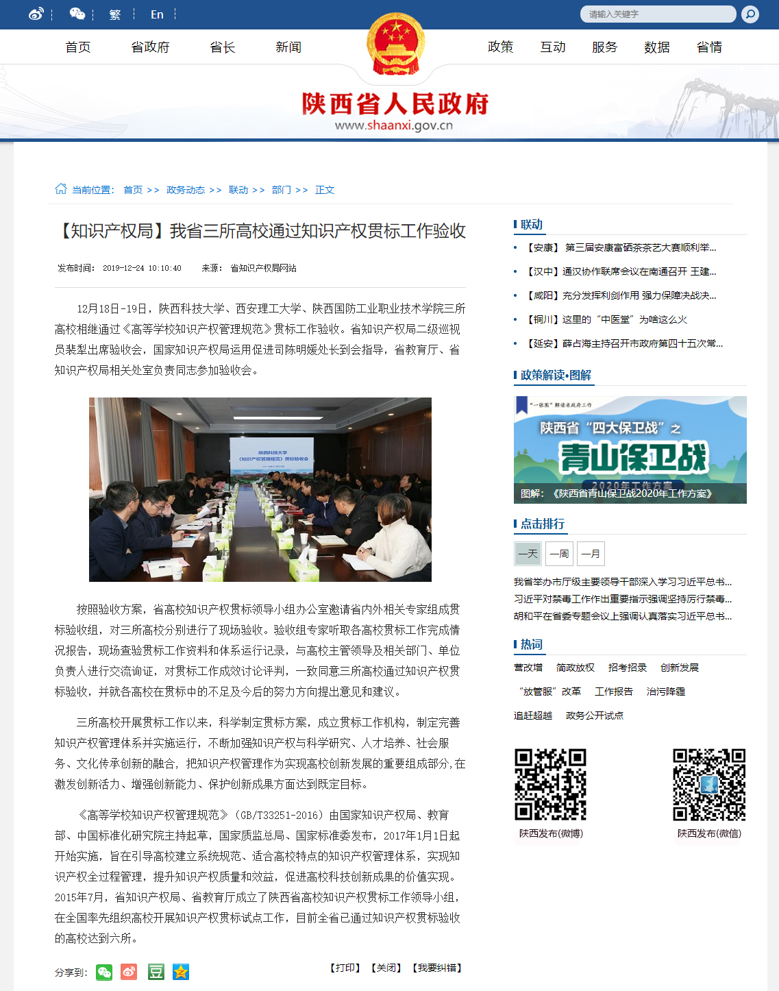 我校《高等学校知识产权管理规范》贯标试点工作顺利通过了陕西省知识产权局、陕西省教育厅组织的专家验收,成为我省第一所通过贯标验收的高职院校。陕西省人民政府网站对包括我校在内的三所高校贯标验收进行了新闻报道。