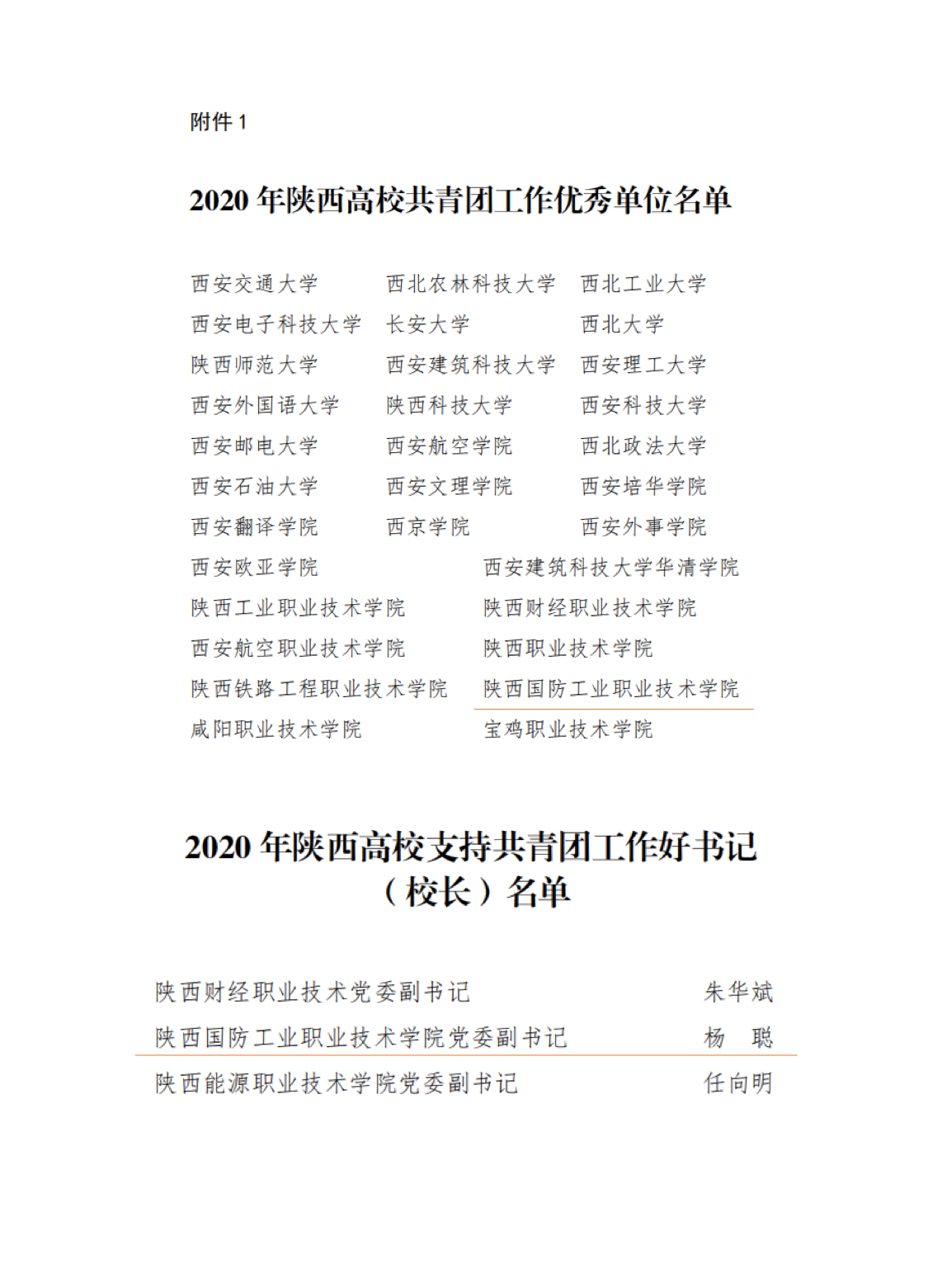 2020年底,在共青团陕西省委组织的述职评议答辩中,我校团委书记张钊参加了汇报答辩,经团省委、省委教育工委评选表彰,授予我校2020年陕西高校共青团工作优秀单位称号,党委副书记杨聪获得“支持共青团工作好书记”称号。