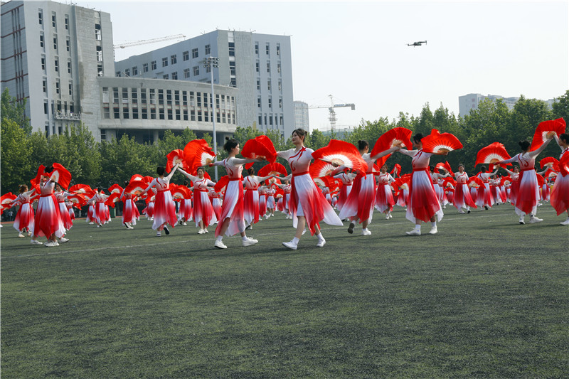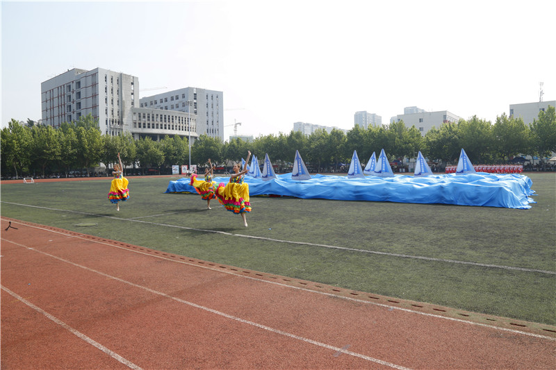 开幕式最后,是精彩炫动的大型团体操表演。第一篇章主题为“喜迎十四运”,由计算机与软件学院、建筑与热能学院带来健美操表演。伴随着动感的节奏,活泼可爱的秦岭四宝和一群手捧花球、青春活力的姑娘们,迈着欢快的脚步,奔跑在国防学院这片滋养心灵的绿茵场上。第二篇章主题为“为扬帆起航”,由智能制造学院、机械工程学院带来武术、彩旗、舞蹈等综合表演,该节目寓意着我校将为“双高”建设竭力前行,扬帆起航。第三篇章主题为“党旗更鲜艳”,由经济管理学院带来扇子舞,女生们舞动绸扇,翩翩起舞,献礼党的百年华诞。鲜艳的党旗随风飘扬,指引着我们奋勇直前,披荆斩棘,在中华民族伟大复兴征程中书写自己的青春华章。