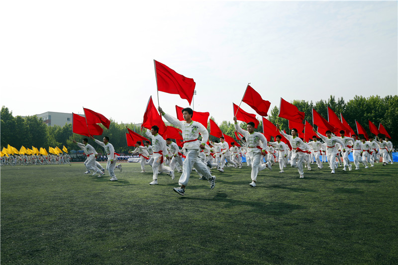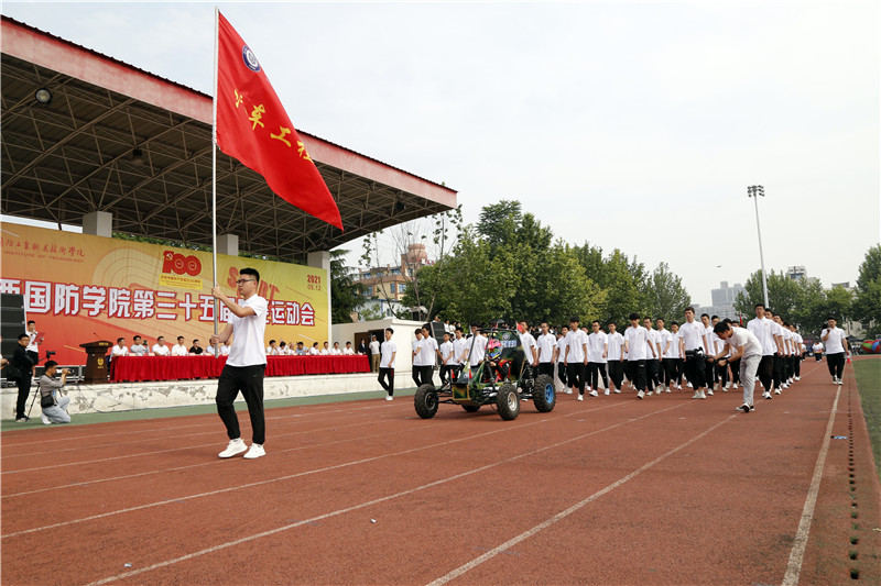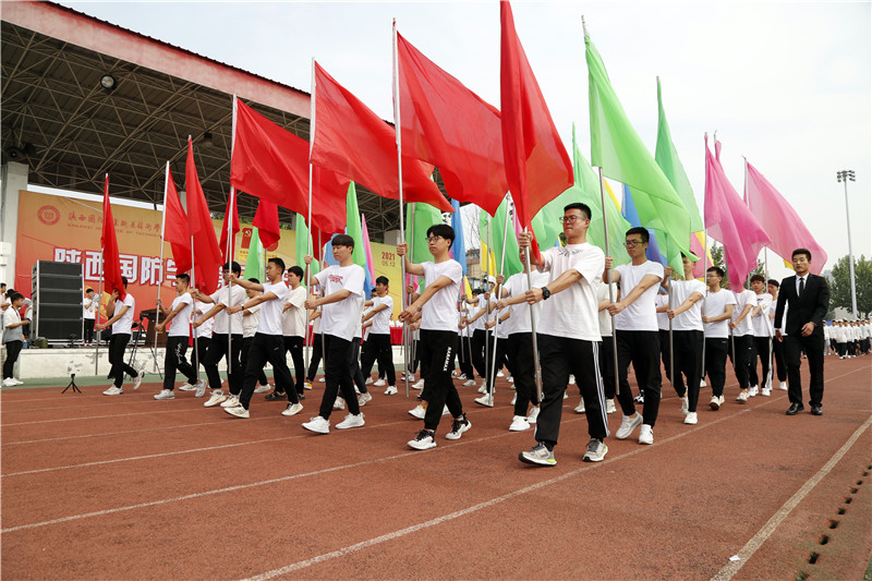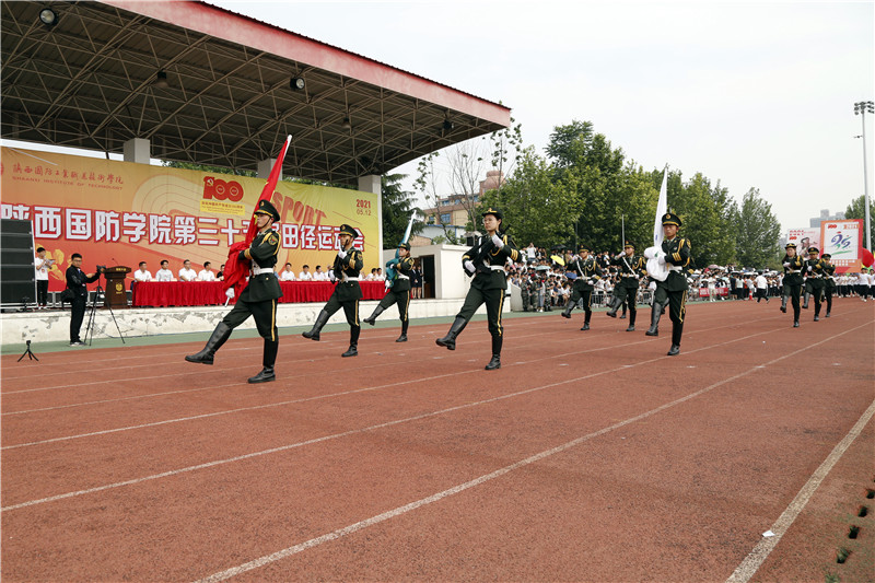 绿茵场上,护旗手庄严地护送国旗、奥运会五环旗和陕西国防职院校旗入场。紧随其后的是由机械工程学院组成的彩旗方阵,方队成员们精神饱满、气宇轩昂,迈着整齐划一、铿锵有力的步伐,高举彩旗,以舞动的青春完美彰显了奥林匹克精神。