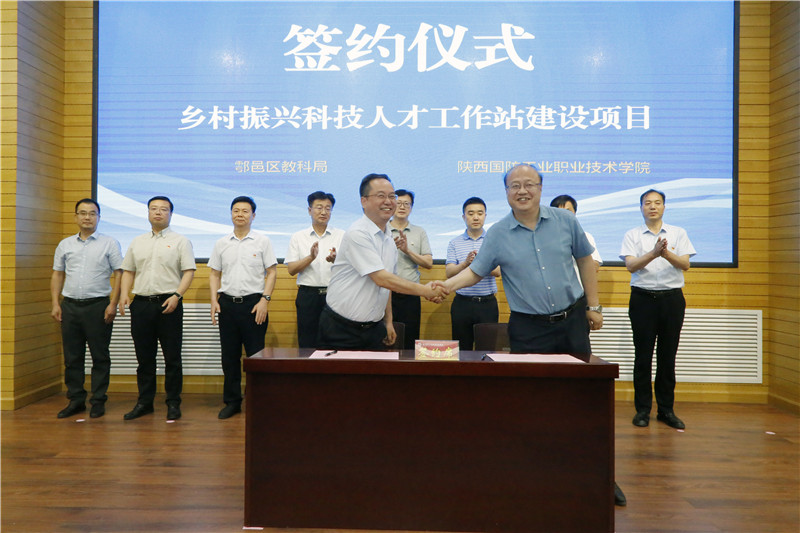 鄠邑区教科局党委书记、局长万世勋与校党委副书记杨聪就乡村振兴科技人才工作站建设项目进行签约