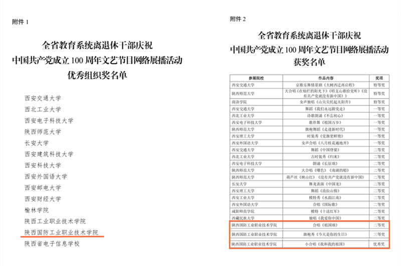 在《“心中的歌唱给党”全省教育系统离退休干部庆祝中国共产党成立100周年文艺节目网络展播活动》中,我校荣获优秀组织奖;我校报送的作品合唱《祖国颂》获得二等奖,旗袍秀《今天是你的生日》获得三等奖,小合唱《我和我的祖国》获得优秀奖。