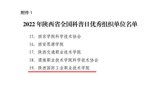 近日,陕西省科学技术协会发布了《关于2022年陕西省全国科普日活动开展情况的通报》(陕科协发〔2022〕普字51号)。陕西省科协在综合考虑全国科普日活动开展情况基础上,经各地各有关单位推荐,省科协研究审议,我校获2022年陕西省全国科普日优秀组织单位奖。省科协希望受到表扬的单位再接再厉、锐意进取,努力践行科技为民、科普惠民,充分发挥主题科普活动的品牌效应和载体作用,以科技志愿服务为抓手,创新活动方式,突出价值引领,大力弘扬科学精神和科学家精神,持续开展各类群众性科普活动,为提高我省全民科学素质、助力陕西高质量发展做出新的更大的贡献。