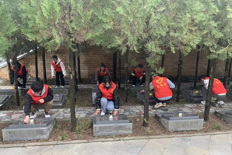 之后,师生前往陵园祭扫墓碑。他们轻轻地拭去烈士墓碑上的浮尘,扫去碑前的尘土,摆放好墓碑上的鲜花,让革命精神永放光芒。忆往昔峥嵘岁月稠,看今朝旖旎风光秀。本次活动使全体师生成功地接受了一次爱国主义教育和革命传统教育,更加激励了我们广大青年牢记使命,铭记幸福生活不能忘记历史,革命人的脚步更需追随,用奉献和担当诠释青春无悔。
