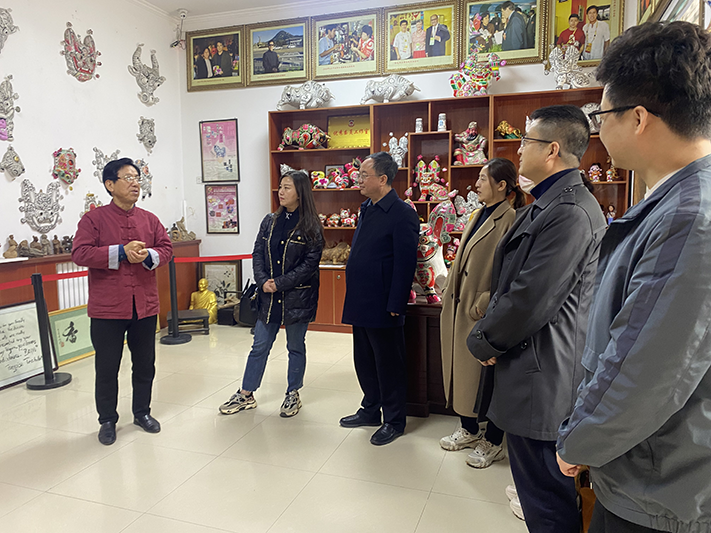 在宝鸡市凤翔区驻村工作队第一书记郑亚辉、六营村党支部书记廖卫军的陪同下,杨聪一行参观了凤翔泥塑博物馆、凤翔木版年画的传习所。期间,国家非物质文化遗产传承人胡新明、邰伟伟分别介绍了凤翔泥塑、木版年画的厚重历史、制作过程和特色工艺。
