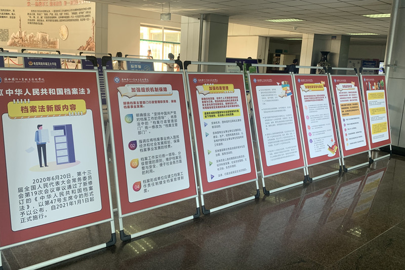 为推动本次活动广泛深入开展,党政办组织师生开展集中宣传活动,图书馆大厅展出档案法宣传展板。档案室教师宣传讲解档案常识及相关法律法规,接受学生咨询。