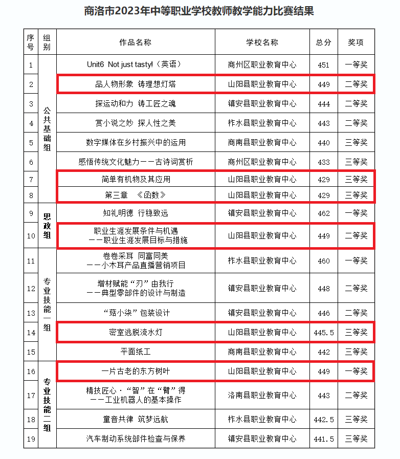 本次教学能力大赛分为公共基础+思政组和专业技能组两大类,商洛市7个县区共30支队伍参加比赛,评委们按照评分细则,对参赛团队的教学视频、教案设计、实施报告、人才培养方案、课程标准等进行认真、细致的评选,山阳职教中心最终获得了6个奖项。
