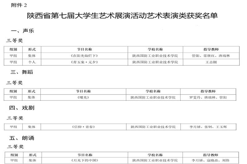 12月7日,陕西省教育厅发文,公布了以“厚植家国情怀,涵养进取品格”为主题的全省第七届大学生艺术展演活动获奖名单,我校报送的作品在本次展演活动中斩获佳绩、实现突破。