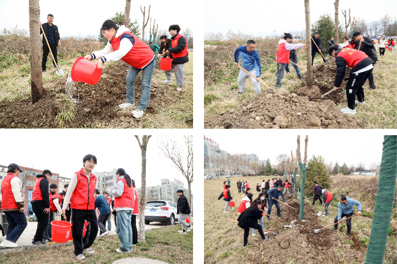 在学校国防南路植树现场,处处洋溢着抛洒汗水的生机活力。老师和志愿者们挥锹铲土、扶苗栽树、培土围堰、提水浇灌,分工协作,干得热火朝天,经过大家共同劳动,一株株树苗很快便迎风挺立。