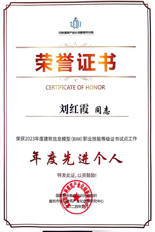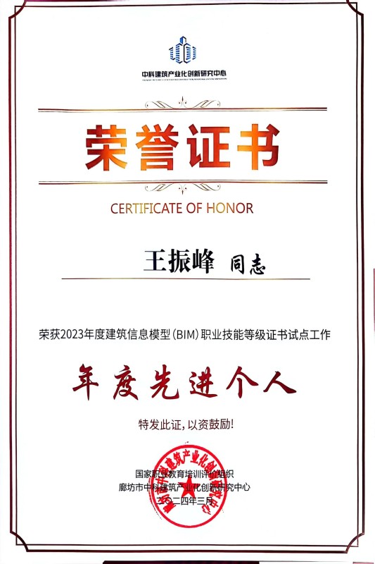 2024年3月,中科建筑产业化创新研究中心公布了2023年全国优秀试点院校评选结果,我校被授予2023年度建筑信息模型(BIM)职业技能等级证书试点工作“年度优秀组织奖”称号,王振峰、刘红霞两位老师被授予“年度先进个人”荣誉称号。