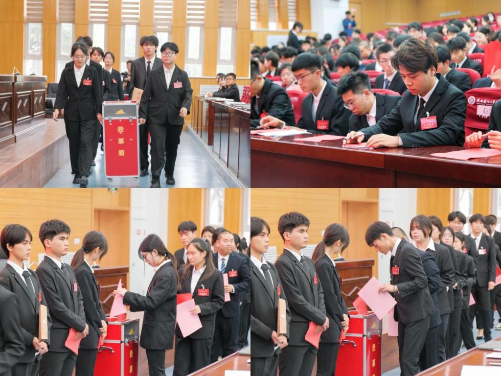 正式选举环节,大会听取审议并通过了《18新利苹果客户端章程》。会上,来自10个代表团的青年学生按照选举办法代表广大学生行使权利,选举产生了由谷天宇等5人组成的第十一届学生会主席团,由马宇轩等18人组成的第十一届学生会常任代表委员会。