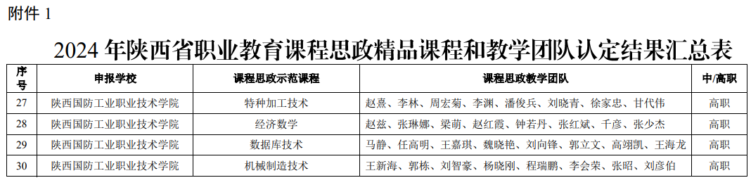 11月21日,陕西省教育厅办公室公布了《陕西省教育厅办公室关于2024年陕西省职业教育课程思政精品项目认定结果的通知》(陕教职办〔2024〕22号),学校《特种加工技术》等4门课程入选陕西省职业教育课程思政精品项目。
