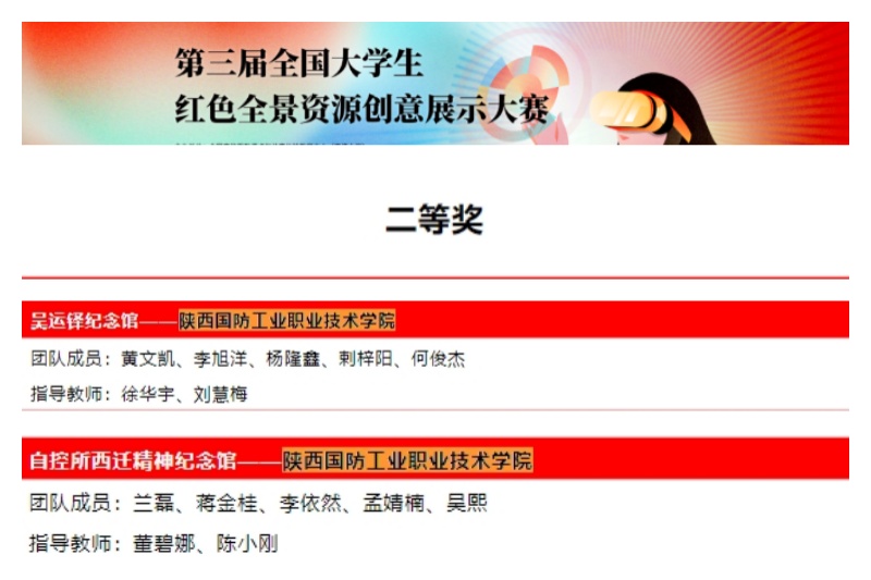 11月26日,第三届全国大学生红色全景资源创意展示大赛结果出炉。我校徐华宇、董碧娜、陈小刚、刘慧梅指导的两支学生团队荣获二等奖。这是学校首次在全国大赛层面收获思政类数字作品奖项,也是学校“数字+思政”创新思路的典型应用案例。