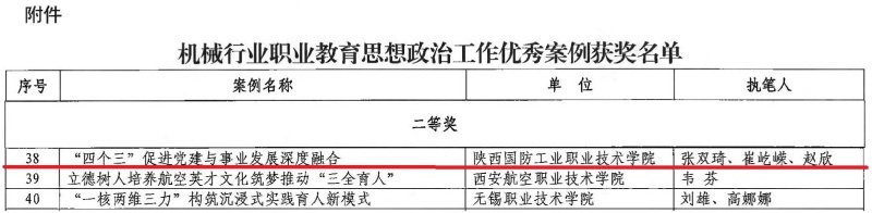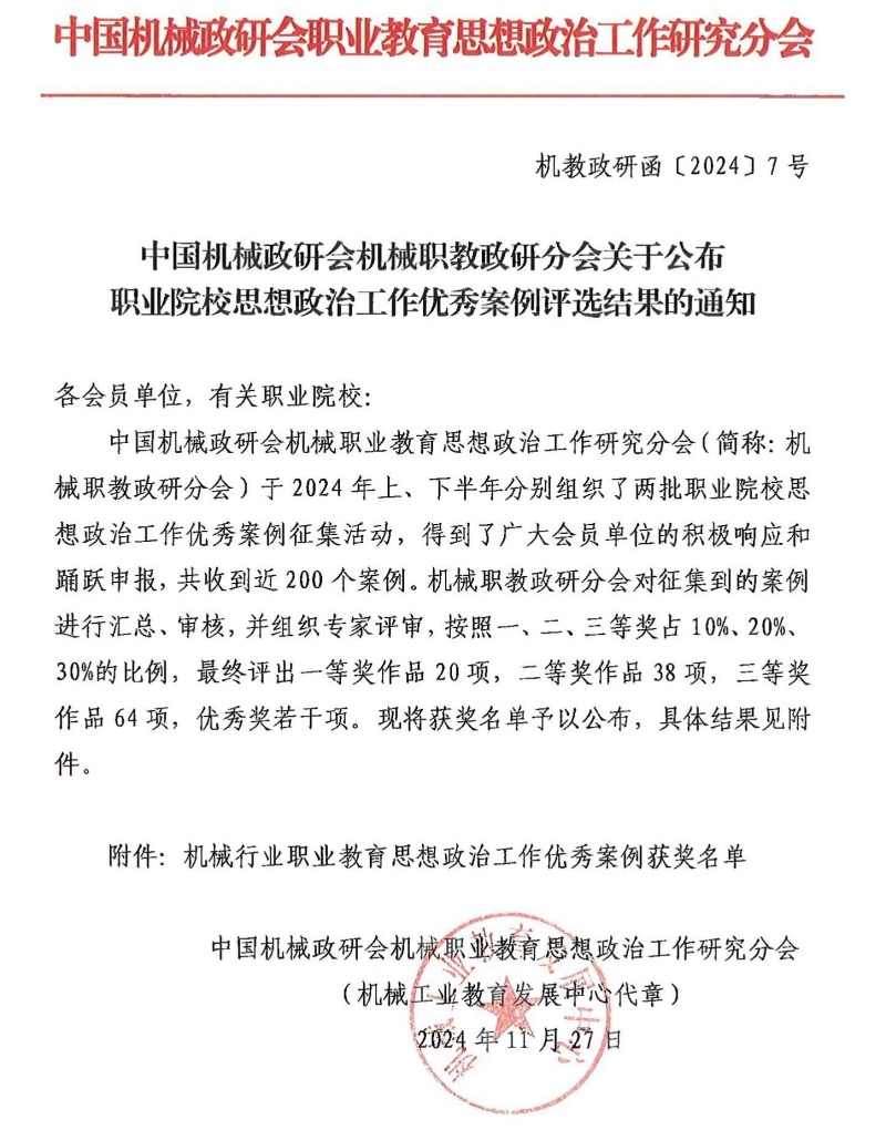 11月27日,中国机械政研会职业教育思想政治工作研究分会公布了基层思想政治工作优秀案例,我校人工智能学院张双琦、崔屹嵘、赵欣等报送的《“四个三”促进党建与事业发展深度融合》荣获二等奖。