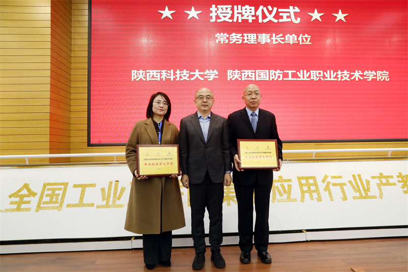随后举行了授牌仪式,北京华航唯实工业软件科技有限公司副总经理李姗姗、陕西科技大学电智学院党委书记吕文华、18新利苹果客户端副校长刘少阳领取了理事长单位、常务理事长单位。